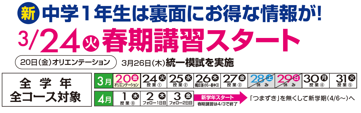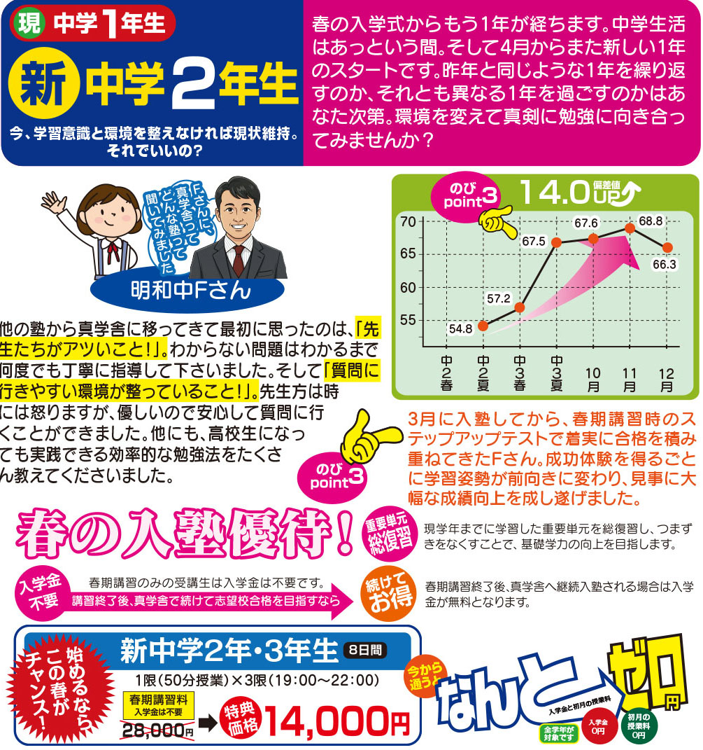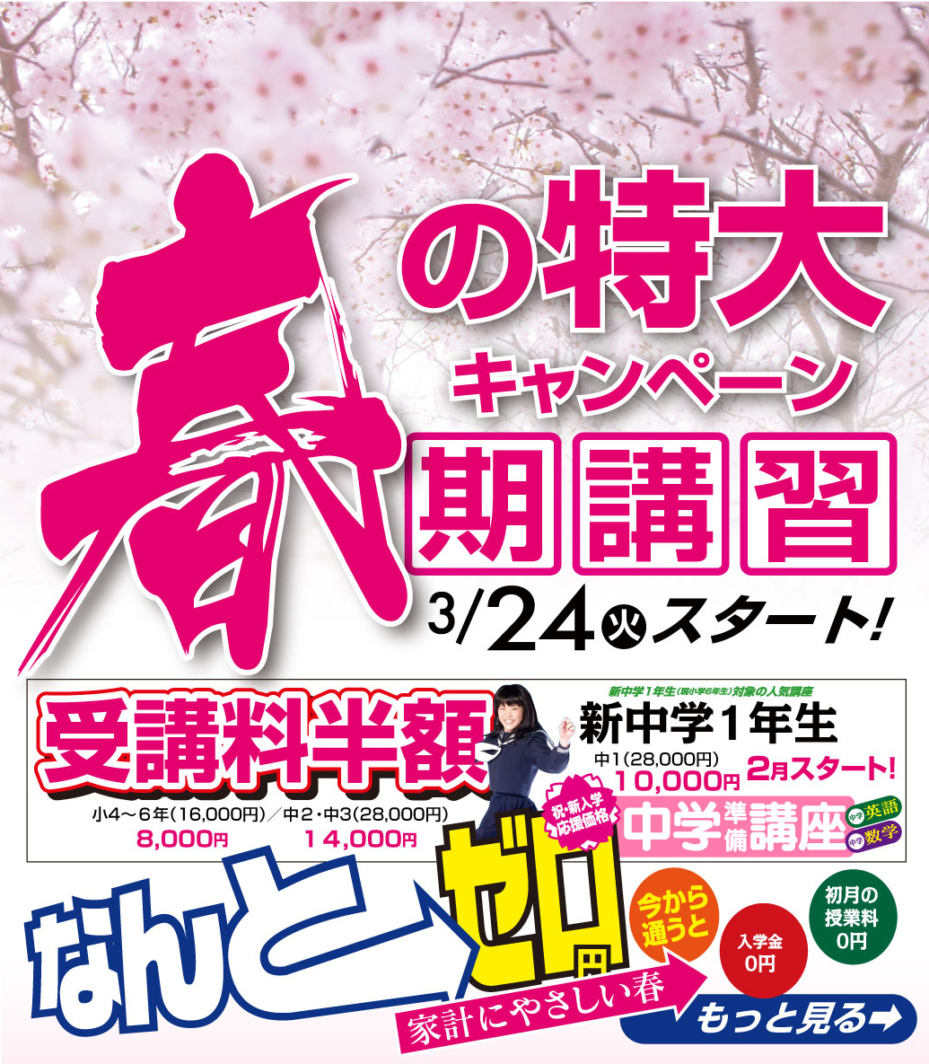 春の入学式からもう1年が経ちます。中学生活はあっという間。そして4月からまた新しい1年のスタートです。昨年と同じような1年を繰り返すのか、それとも異なる1年を過ごすのかはあなた次第。環境を変えて真剣に勉強に向き合ってみませんか?