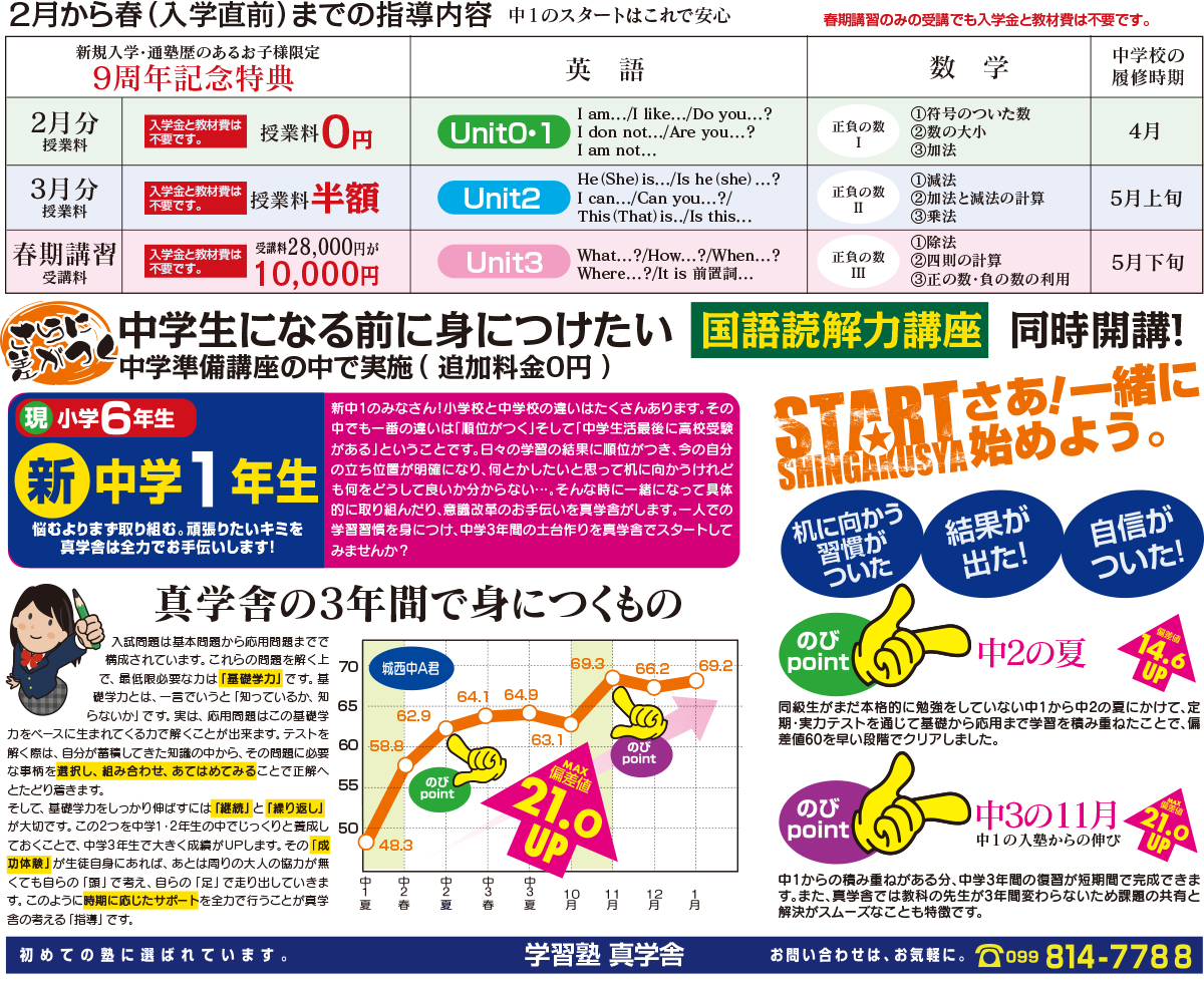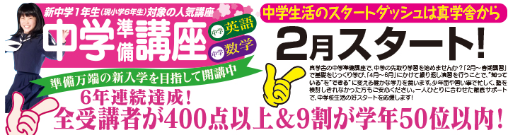真学舎の中学準備講座で、中学の先取り学習を始めませんか?「2月〜春期講習」で基礎をじっくり学び、「4月〜6月」にかけて繰り返し演習を行うことで、“知っている”を“できる”に変える確かな学力を養います。少年団や習い事で忙しく、塾を検討しきれなかった方もご安心ください。一人ひとりに合わせた徹底サポートで、中学校生活の好スタートを応援します!鹿児島県の中三統一模試で鹿児島県1位になる生徒もここからスタートします。
