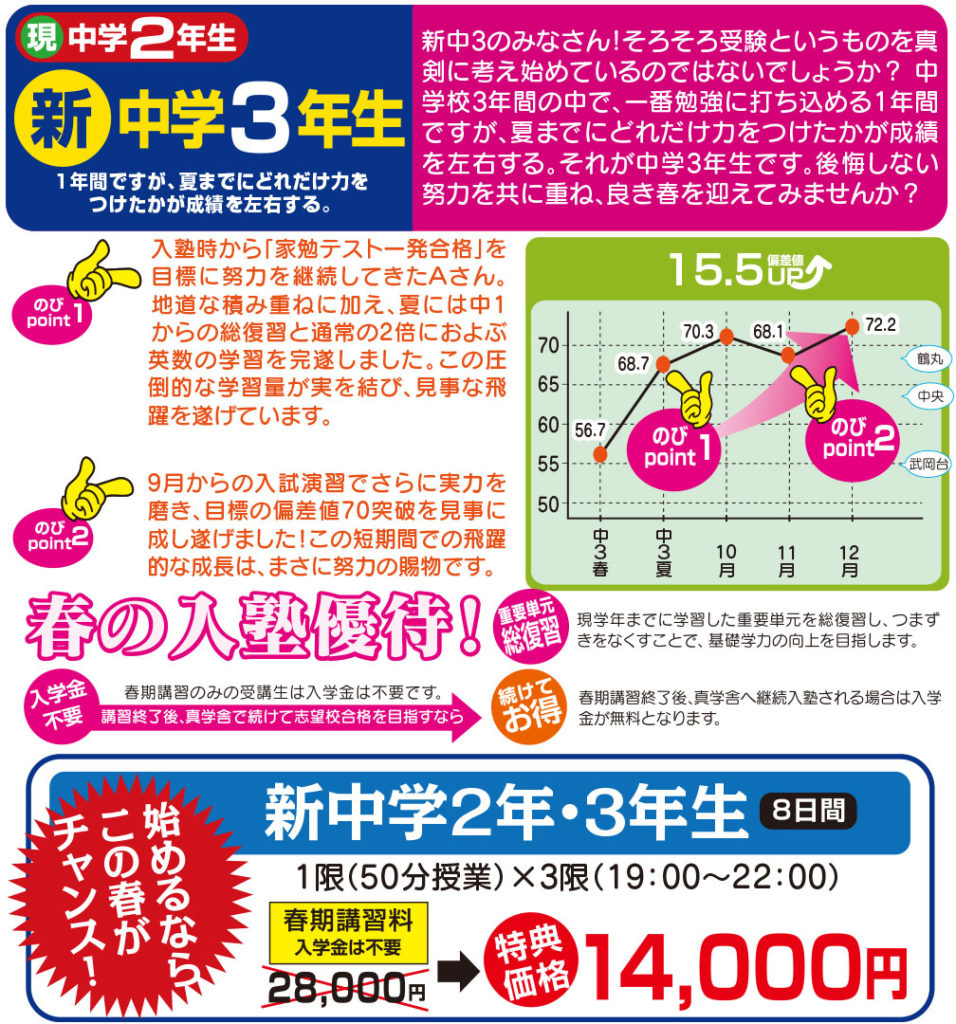 新中3のみなさん!そろそろ受験というものを真剣に考え始めているのではないでしょうか? 中学校3年間の中で、一番勉強に打ち込める1年間ですが、夏までにどれだけ力をつけたかが成績を左右する。それが中学3年生です。後悔しない努力を共に重ね、良き春を迎えてみませんか?