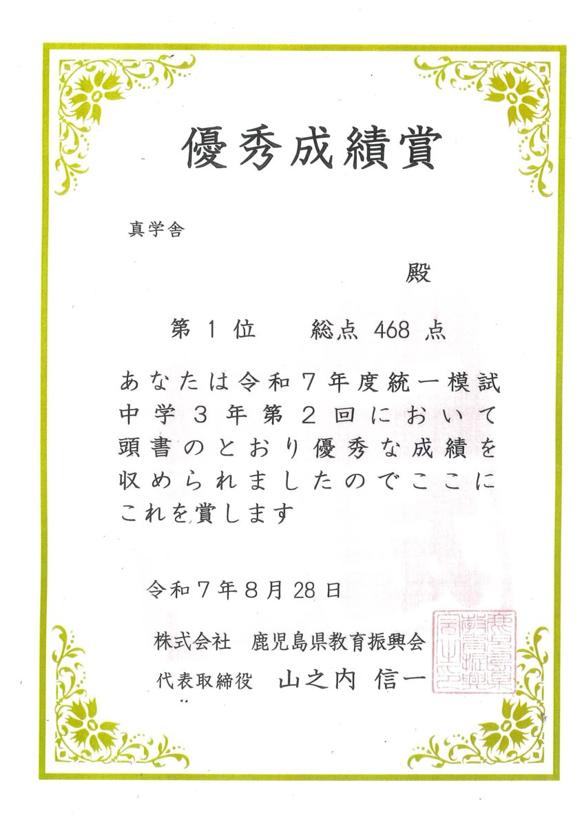 学習塾真学舎県模試1位賞状 | 学習塾 真学舎で志望校合格した。君もTOPを目指してみないか。
